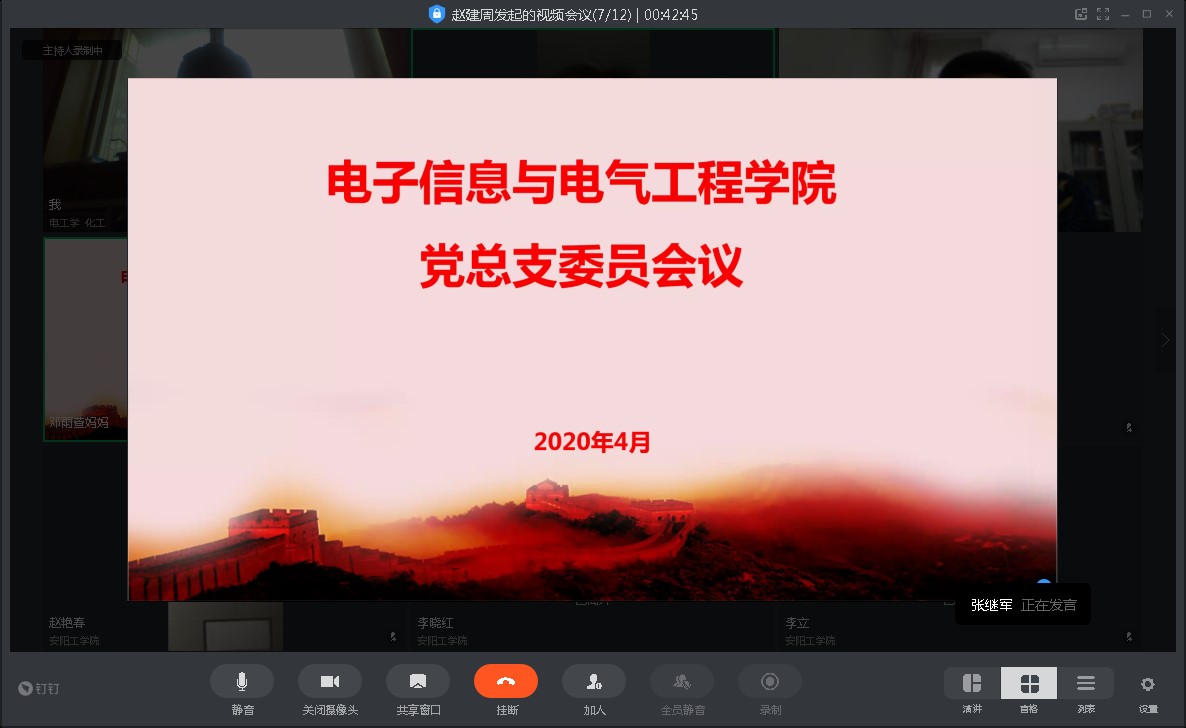 为进一步贯彻落实上级有关加强疫情防控和有序复工复学的工作方案要求,做好学生返校前各项准备工作,电子信息与电子工程学院党总支于4月1日召开了以 “落实疫情防控,做足返校准备工作”为主题的总支委员视频会议,参会人员有党总支书记张继军,副书记赵建周、尹艺蓓及各党总支委员。