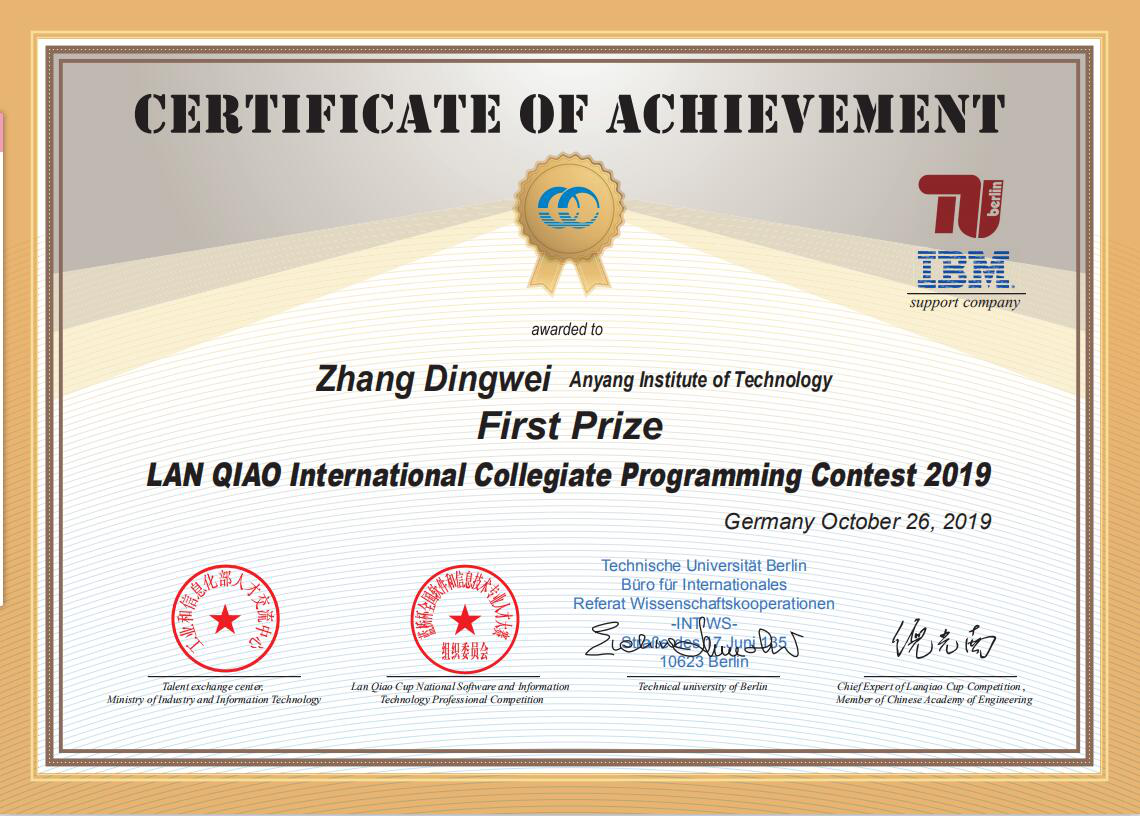 支部党员孙高飞指导学生张丁韦荣获蓝桥杯国际赛一等奖