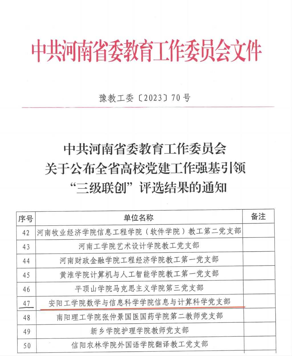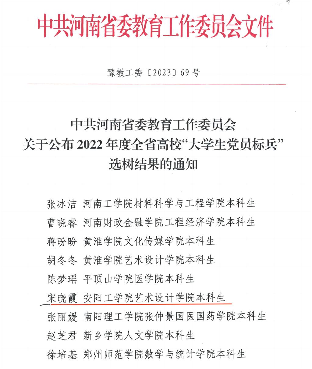 近日,河南省委教育工委公布了全省高校党建工作强基引领“三级联创”评选结果和2022年度全省高校“大学生党员标兵”选树结果。我校数学与信息科学学院信息与计算科学党支部被评为“全省党建工作样板党支部”;艺术设计学院宋晓霞同学荣获2022年度全省高校“大学生党员标兵”称号。