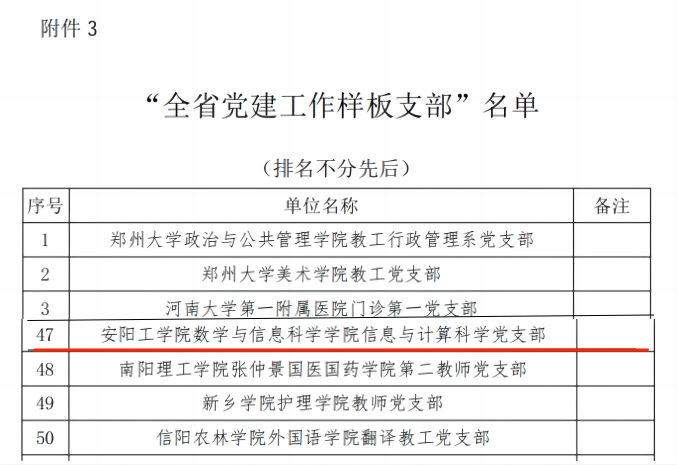 近日,中共河南省委教育工作委员会下发了《关于公布全省高校党建工作强基引领“三级联创”评选结果的通知》(豫教工委〔2023〕70号),数信学院信息与计算科学党支部被评为“全省党建工作样板支部”。